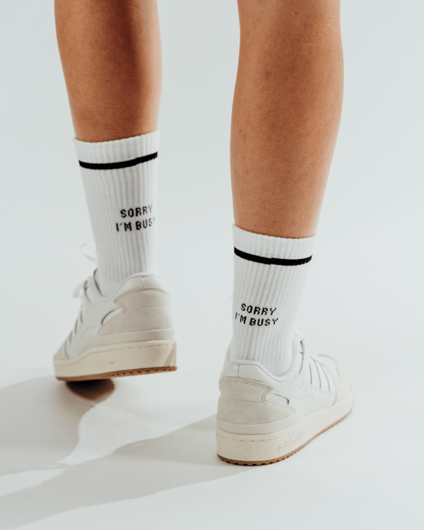 Keine Zeit, aber mit Stil. SORRY I’M BUSY ist der freundlichste Weg, sich abzugrenzen. Schwarze Message auf weißem Socken, mit Retro-Streifen.