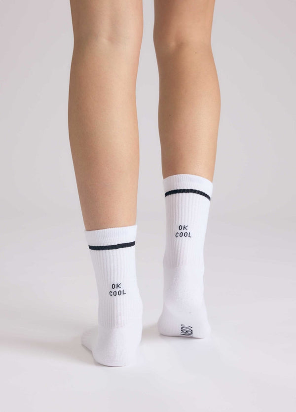 Lässig bleibt cool. OK COOL ist die Antwort auf alles, was keine braucht – ironisch, entspannt, smart. Schwarze Message auf weißem Socken, mit Retro-Streifen.